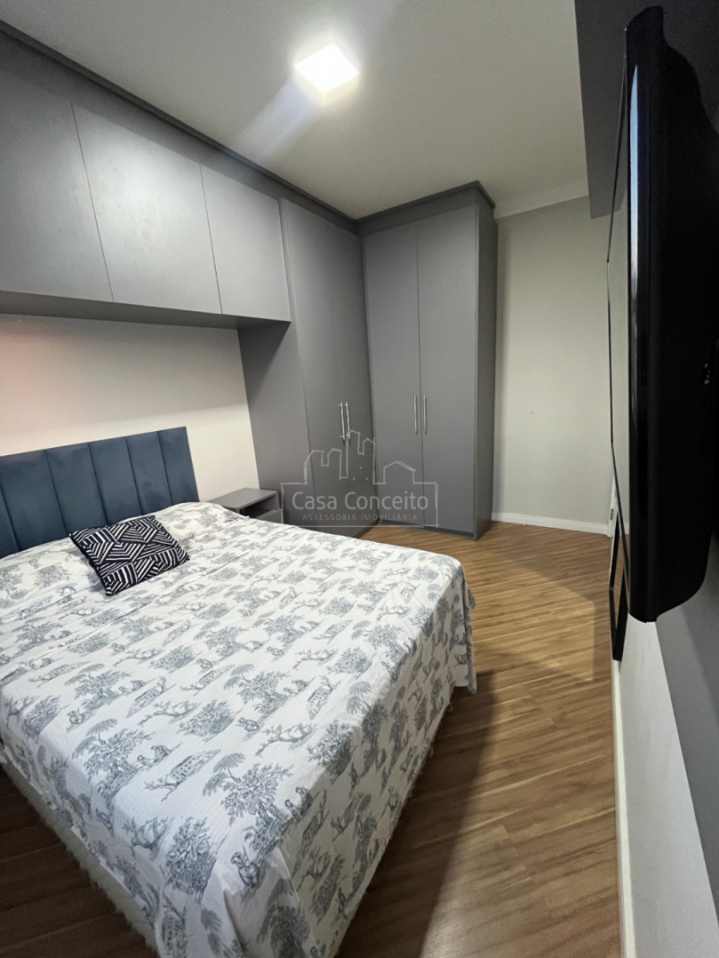 ✔ Quarto principal com guarda-roupa, criado-mudo e painel de TV planejados – um verdadeiro refúgio de descanso.