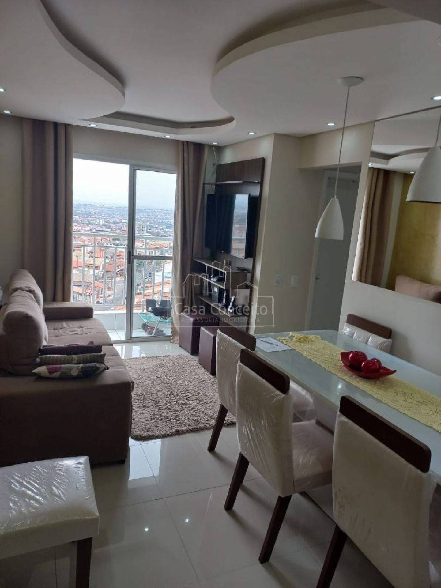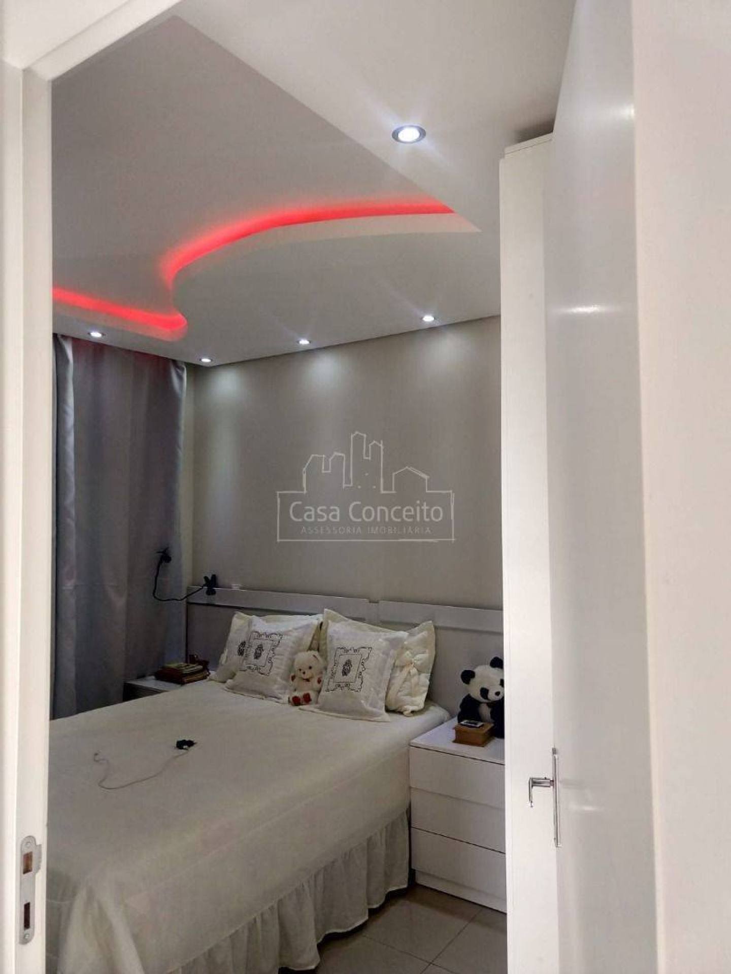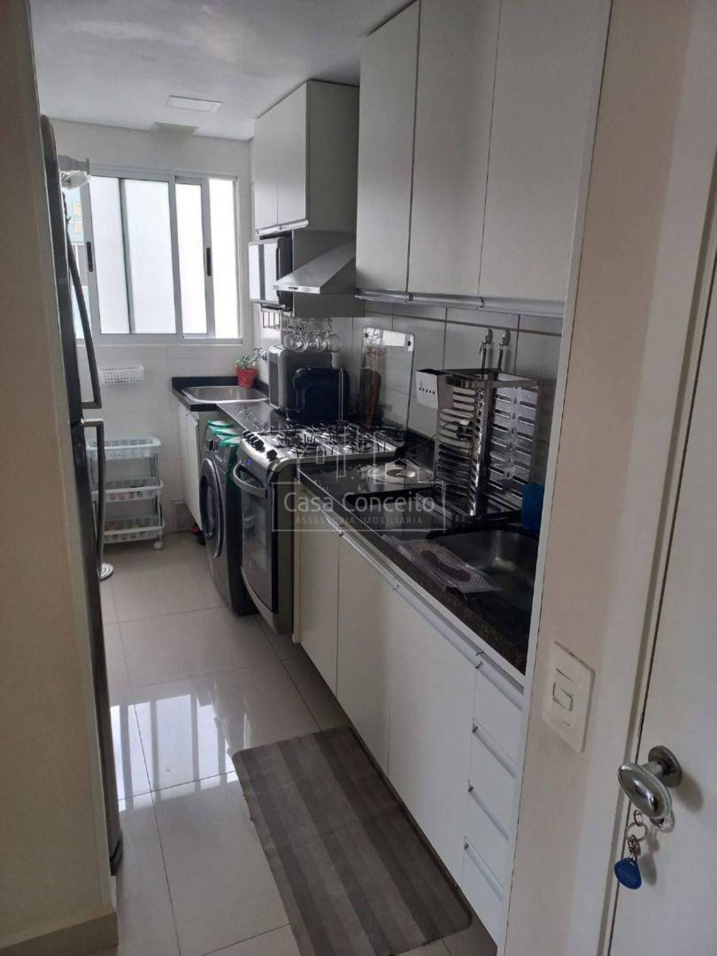 Apartamento com 2 dormitórios, sala com parede marmorizada, painel para TV, luminárias e sanca, integrados à cozinha com armários planejados. Banheiro completo com armário, espelho e box. Piso porcelanato em todo o imóvel, grafiato antiumidade e lavanderia funcional.